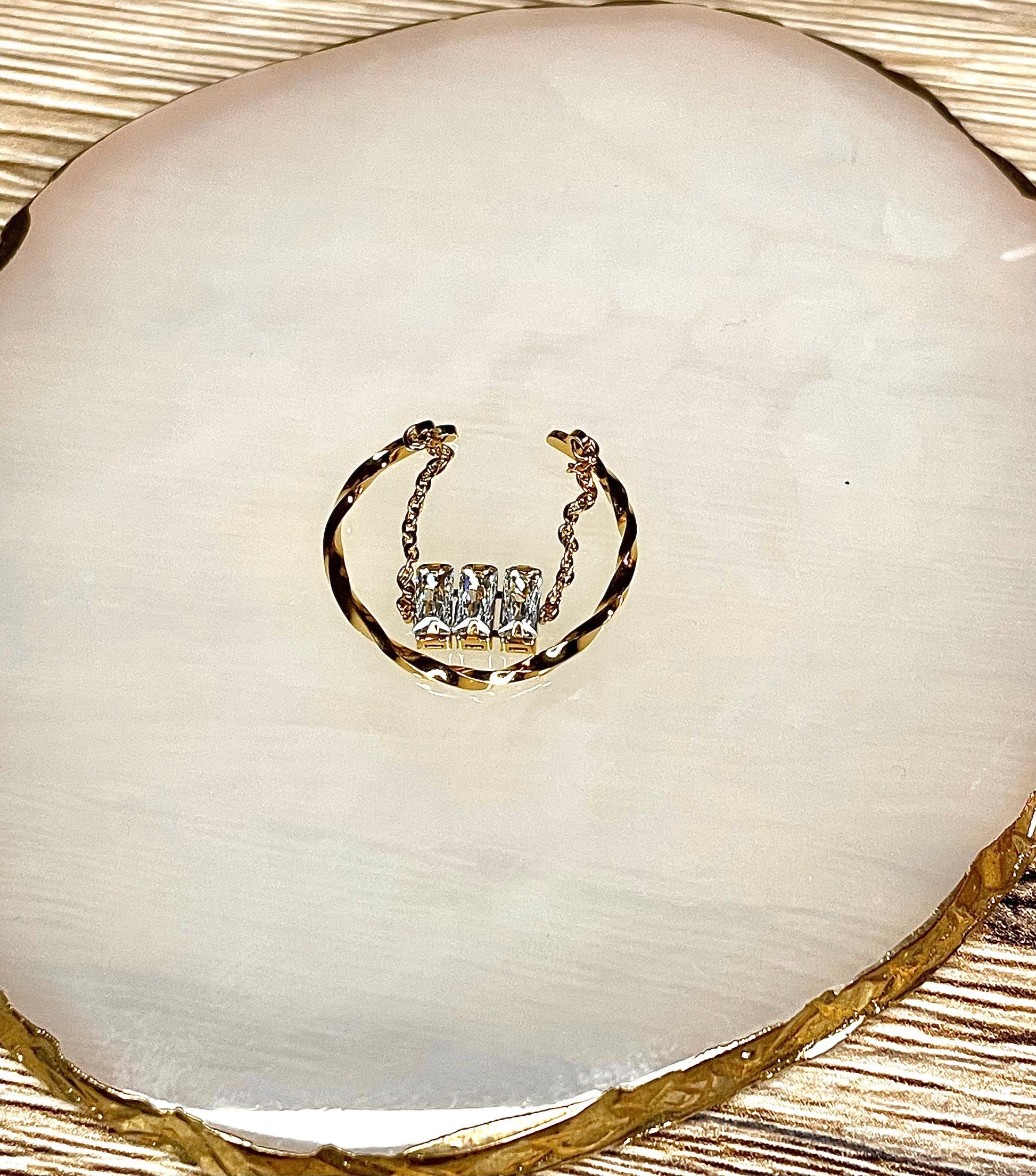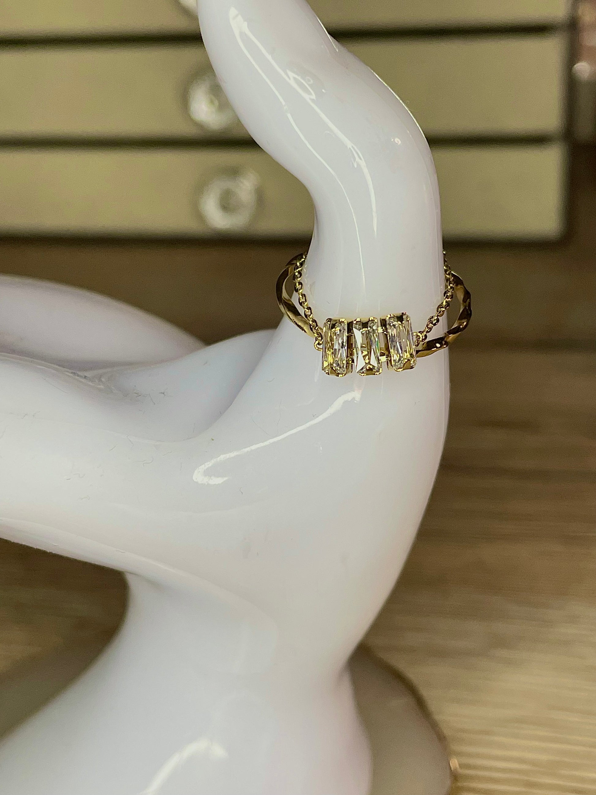 Bague Tina, chaîne 3 strass carrés, acier inoxydable doré.