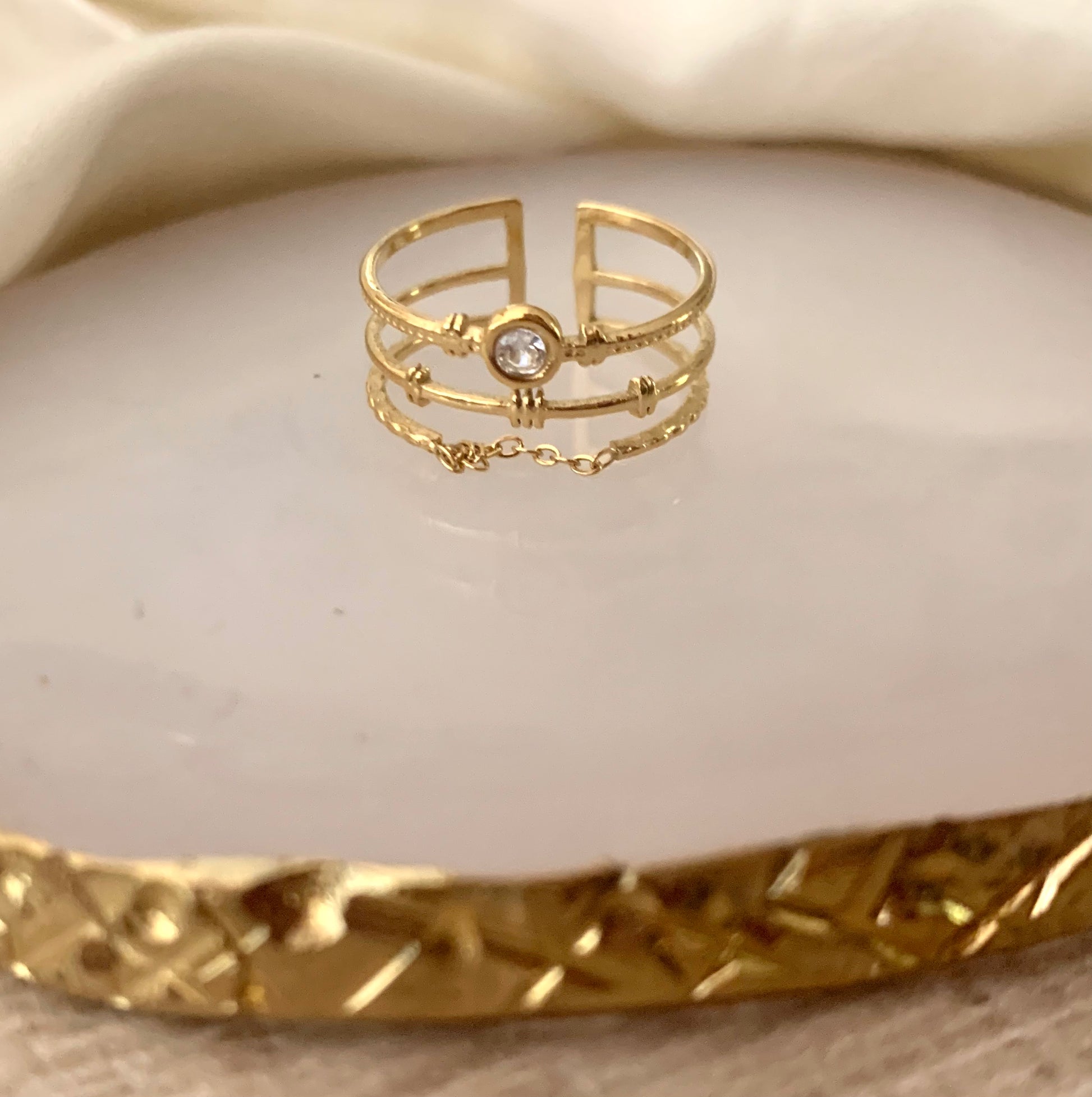 Bague Nelly triples anneaux, chaine & strass , acier inoxydable doré.