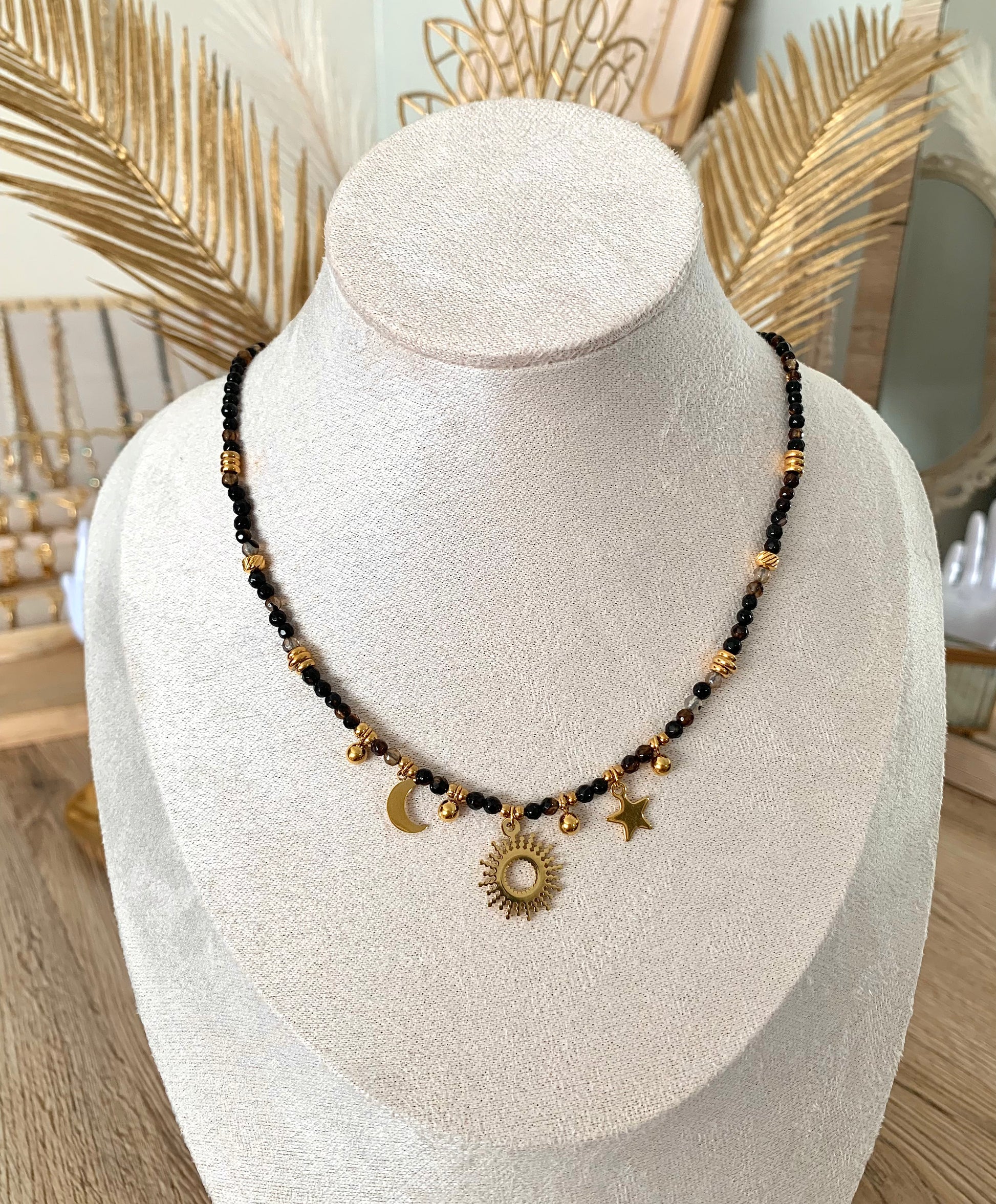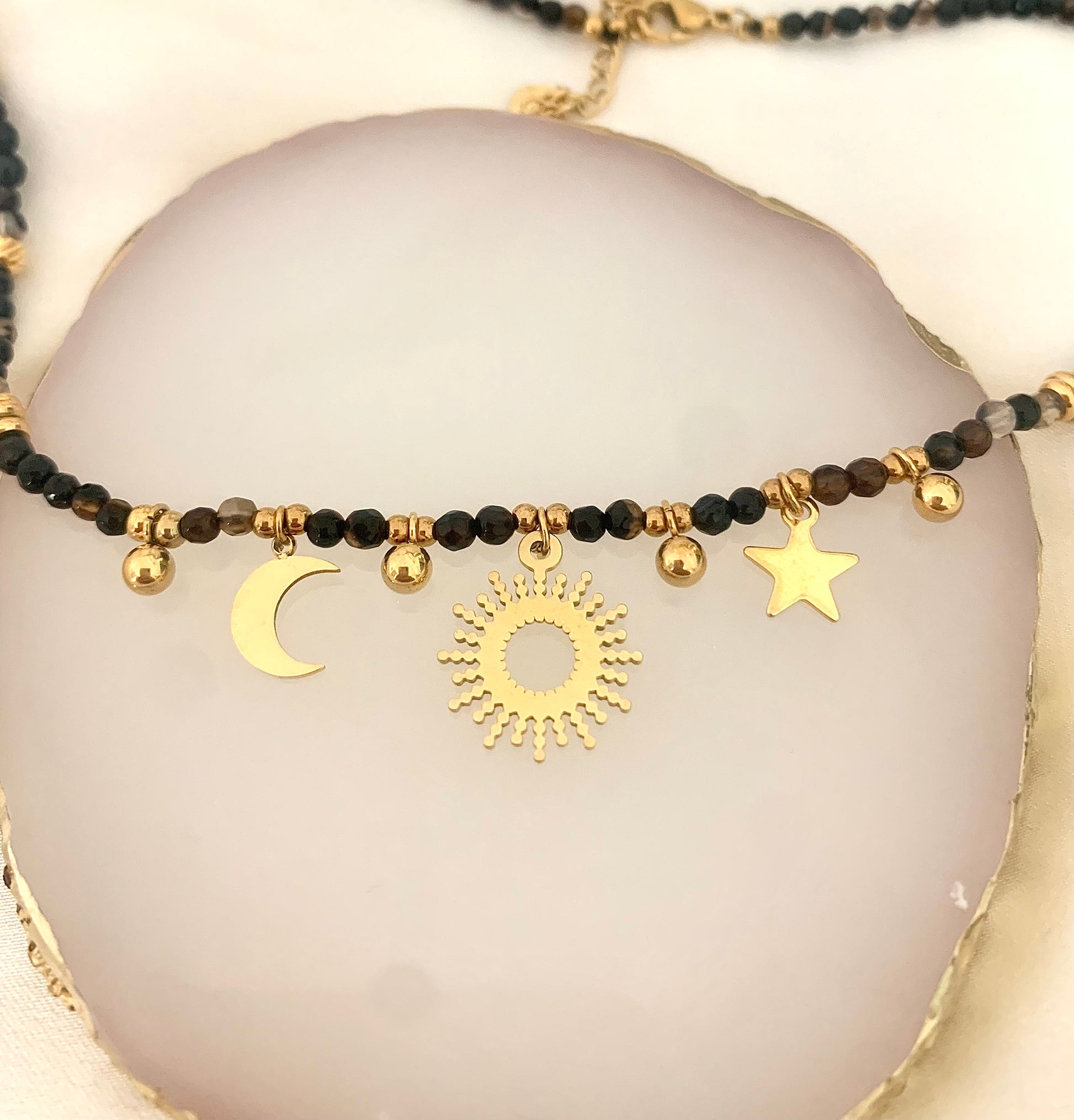 Collier Alix, avec des charms, étoile lune soleil et des billes en pierre naturelle, acier inoxydable doré.
